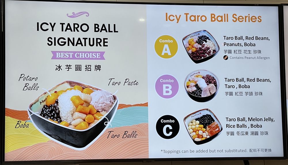 (Taro Balls, Shaved Ice, Taro Paste, Potato Taro Balls, Boba)