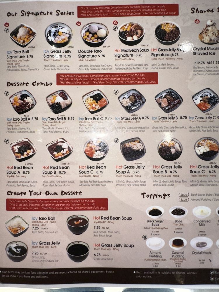 (Grass Jelly Soup, Mini Taro Balls, Taro, Red Beans, Boba)