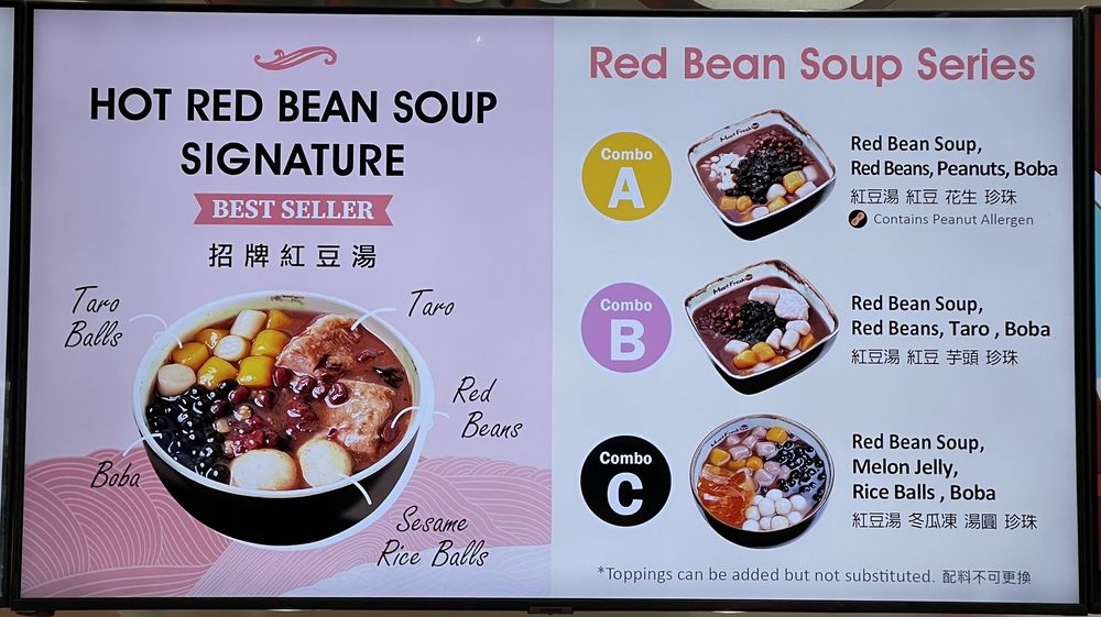(Taro Balls, Red Bean Soup, Red Beans, Peanuts, Boba)